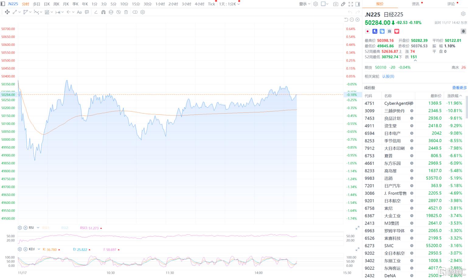 日本电子、良品计划、资生堂、三丽鸥跌超9%,日本航空跌超5%,索尼、日本航空跌超3%。