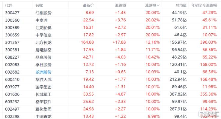 红相股份、中富通、江龙船艇、中孚信息20cm涨停,孚日股份、龙洲股份、长城军工、航天发展等10余股涨停。