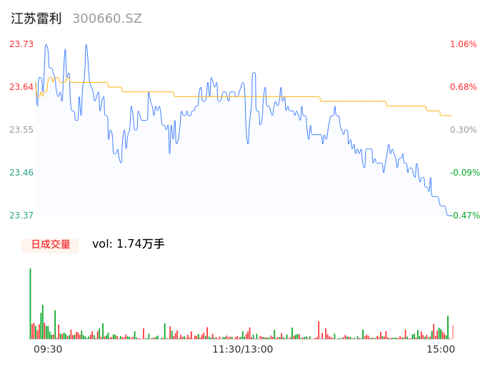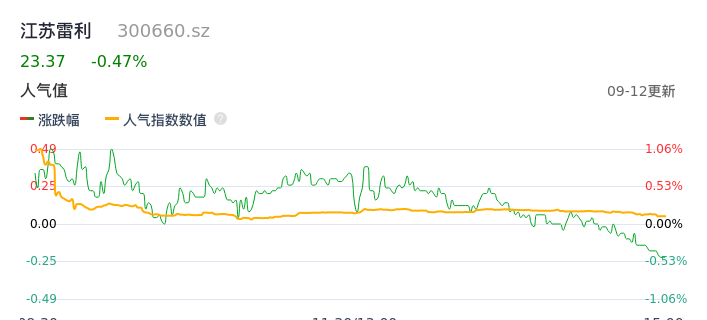 09月12日,江苏雷利收报23.37,股价涨幅-0.47%,成交金额4106.20万,换手率0.55%。