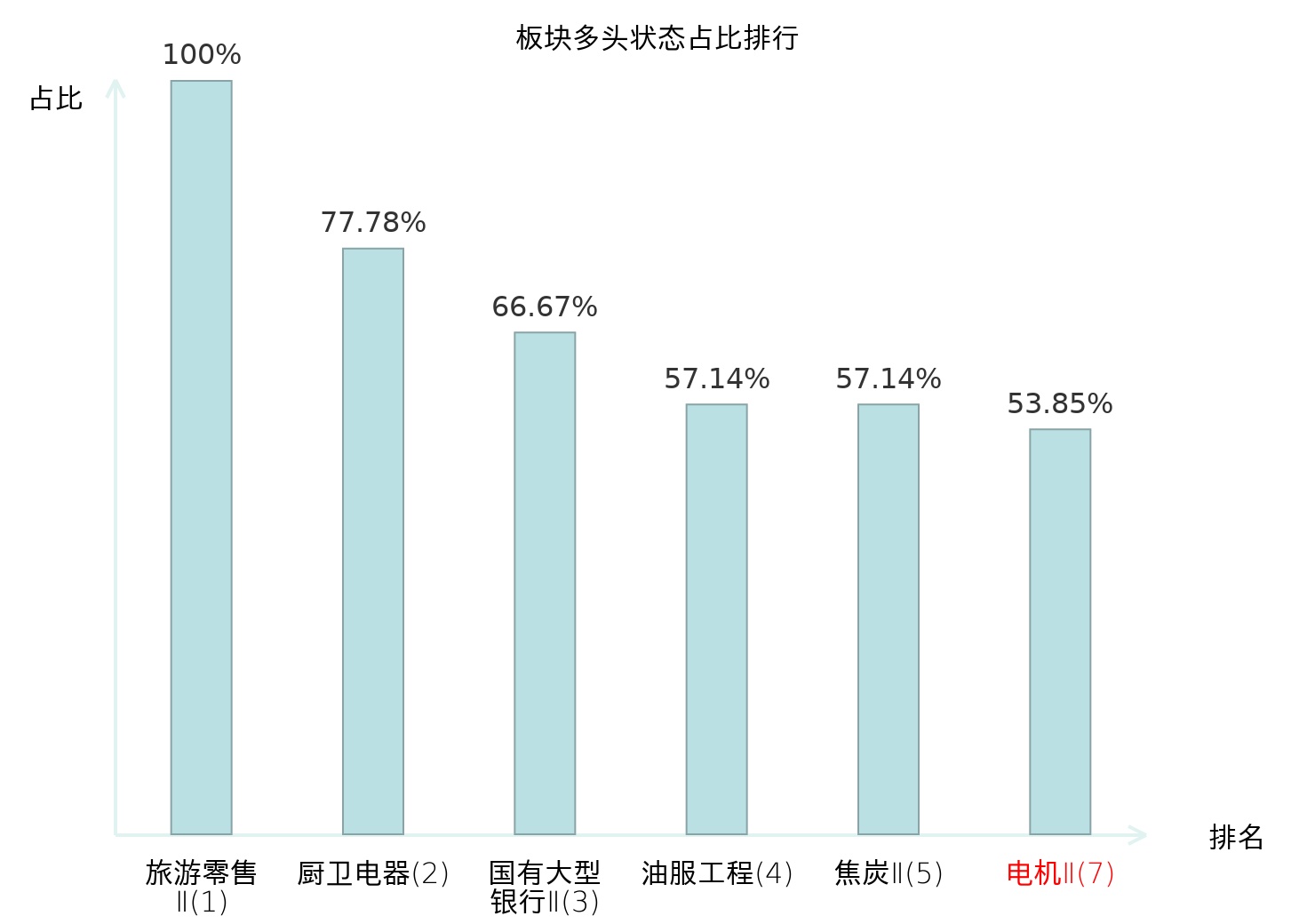 全市场所有行业板块中主力多头状态占比排名中,旅游零售Ⅱ板块位居第一。房地产服务板块名次提升最快,较昨日上升71位。