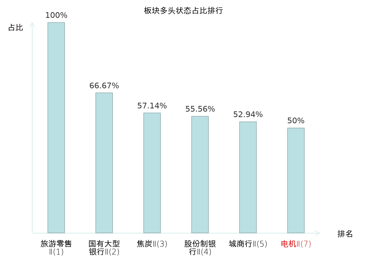 全市场所有行业板块中主力多头状态占比排名中,旅游零售Ⅱ板块位居第一。其他家电Ⅱ板块名次提升最快,较昨日上升101位。