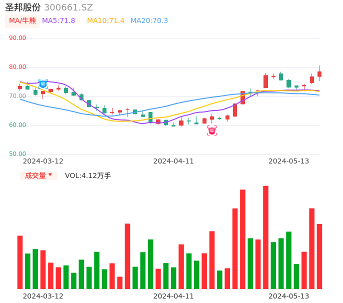 05月13日,圣邦股份收报78.40,股价涨幅2.27%,成交金额3.23亿元,换手率0.92%。