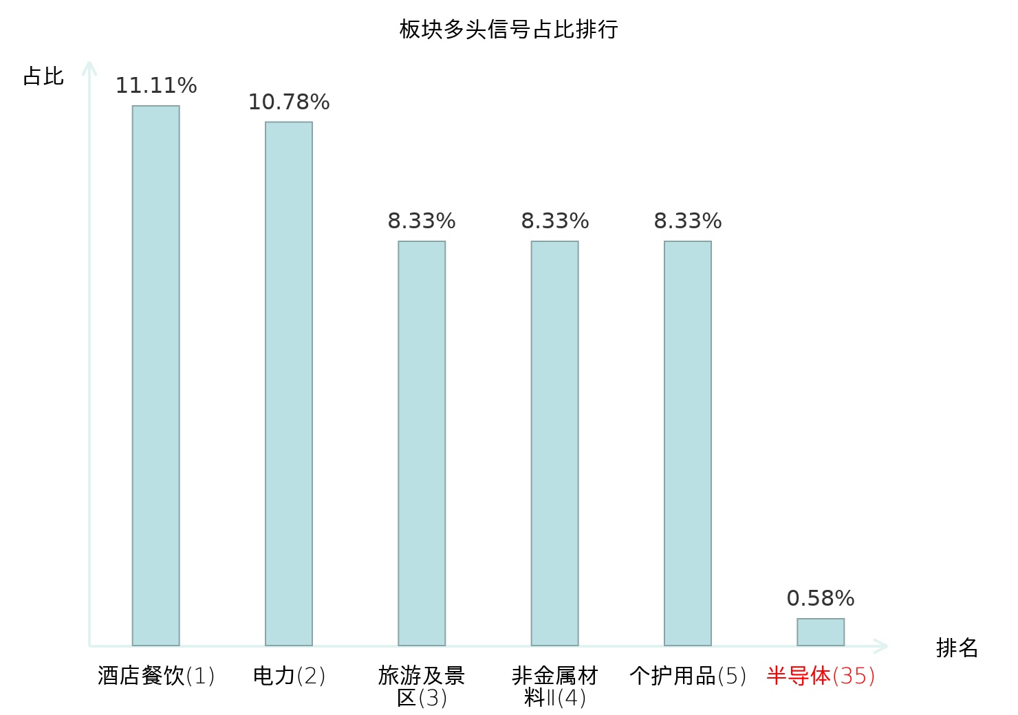从主力宝信号数据分析,圣邦股份所属的半导体板块中共1只股票发出主力多头信号,主力多头信号占比在全行业中排名第35位,较昨日下降6位;较高的排名表明主力当日买入意愿较强,此次排名下降可能反映了主力对该板块态度的微调;全市场所有行业板块中主力多头信号占比排名中,酒店餐饮板块位居第一;航运港口板块名次提升最快,较昨日上升87位;这些变动揭示了不同行业间主力资金动向的结构性差异,为投资者评估市场情绪分布及潜在关注方向提供了客观依据。