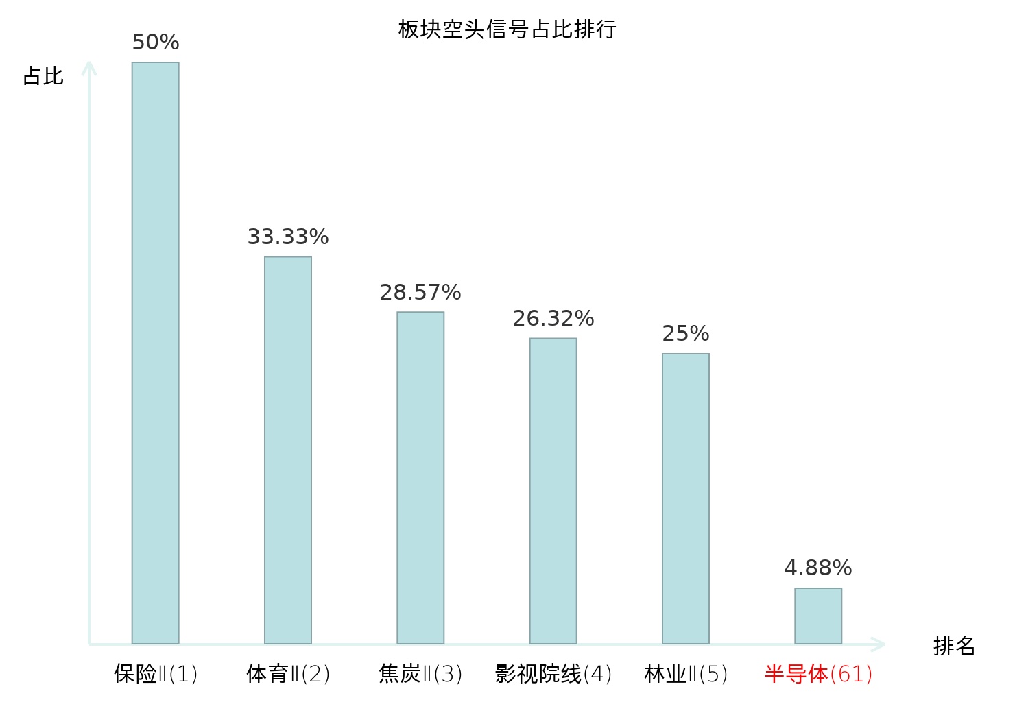 全市场所有行业板块中主力空头信号占比排名中,保险Ⅱ板块位居第一。装修建材板块名次提升最快,较昨日上升118位。