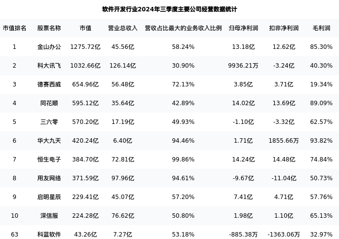科蓝软件最新报告期数据为三季度,下表汇总了软件开发行业内市值靠前的公司三季度主要经营数据