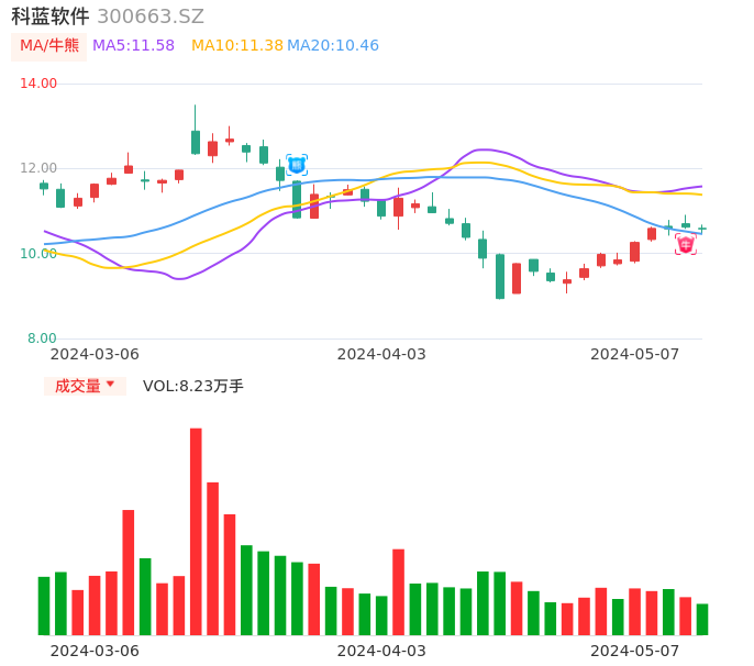05月07日,科蓝软件收报10.58,股价涨幅-0.38%,成交金额8696.15万元,换手率1.98%。