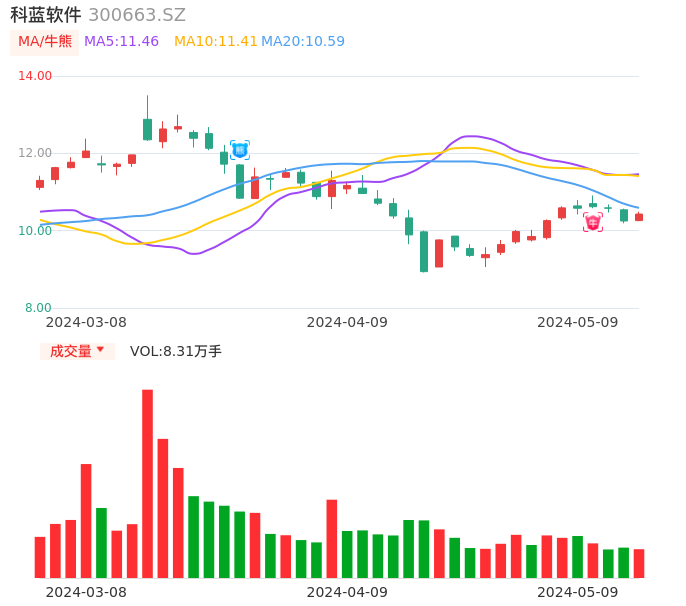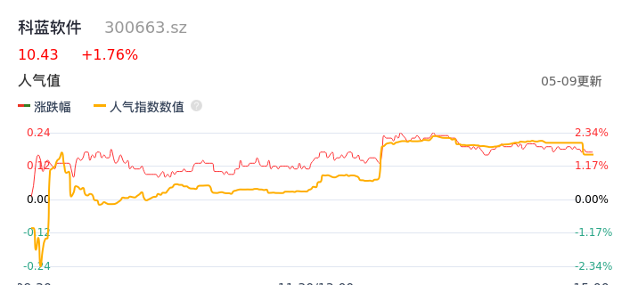 05月09日,科蓝软件收报10.43,股价涨幅1.76%,成交金额8640.70万元,换手率2.00%。