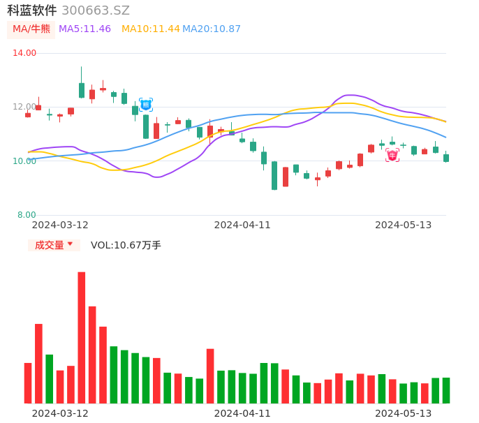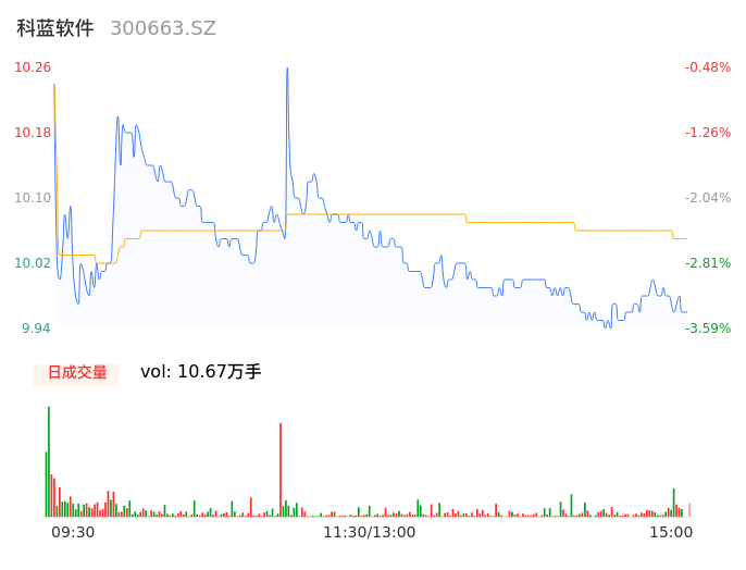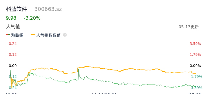 05月13日,科蓝软件收报9.98,股价涨幅-3.20%,成交金额1.07亿元,换手率2.57%。