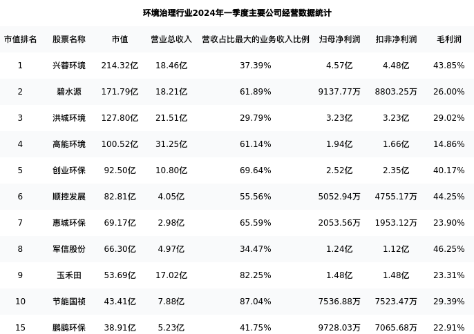 鹏鹞环保最新报告期数据为一季度,下表汇总了环境治理行业内市值靠前的公司一季度主要经营数据