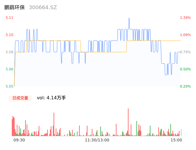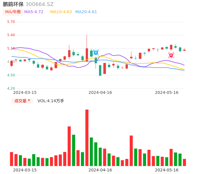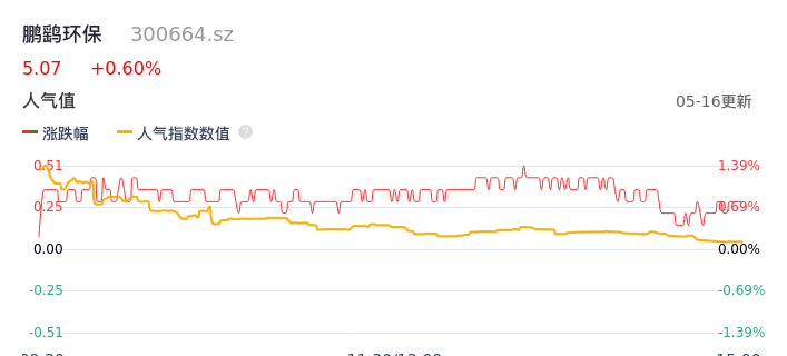 05月16日,鹏鹞环保收报5.07,股价涨幅0.60%,成交金额2104.88万元,换手率0.54%。