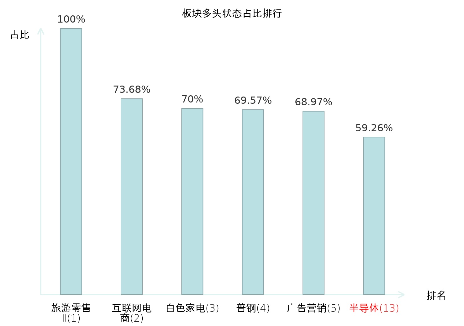 全市场所有行业板块中主力多头状态占比排名中,旅游零售Ⅱ板块位居第一。其他家电Ⅱ板块名次提升最快,较昨日上升66位。