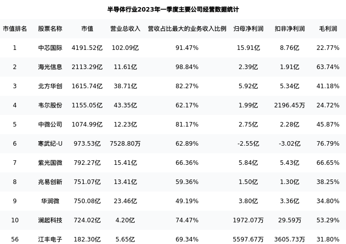 江丰电子最新报告期数据为一季度,下表汇总了半导体行业内市值靠前的公司一季度主要经营数据