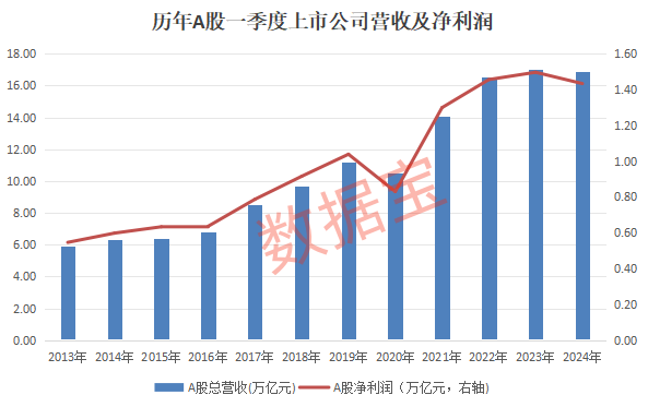 据证券时报·数据宝统计,截至4月30日,除个别上市公司延期披露外,A股上市公司一季报已基本披露完毕。按可比计算,今年第一季度A股公司实现总营收16.92万亿元,同比增长0.16%;实现净利润1.43万亿元,同比下滑4.72%。