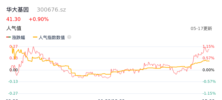 05月17日,华大基因收报41.30,股价涨幅0.90%,成交金额8411.03万元,换手率0.50%。