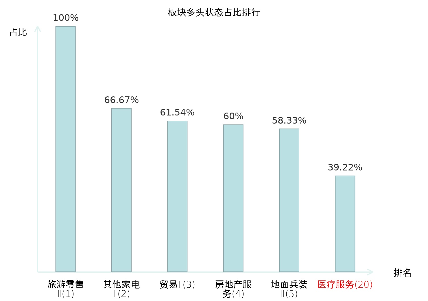 全市场所有行业板块中主力多头状态占比排名中,旅游零售Ⅱ板块位居第一。化妆品板块名次提升最快,较昨日上升62位。