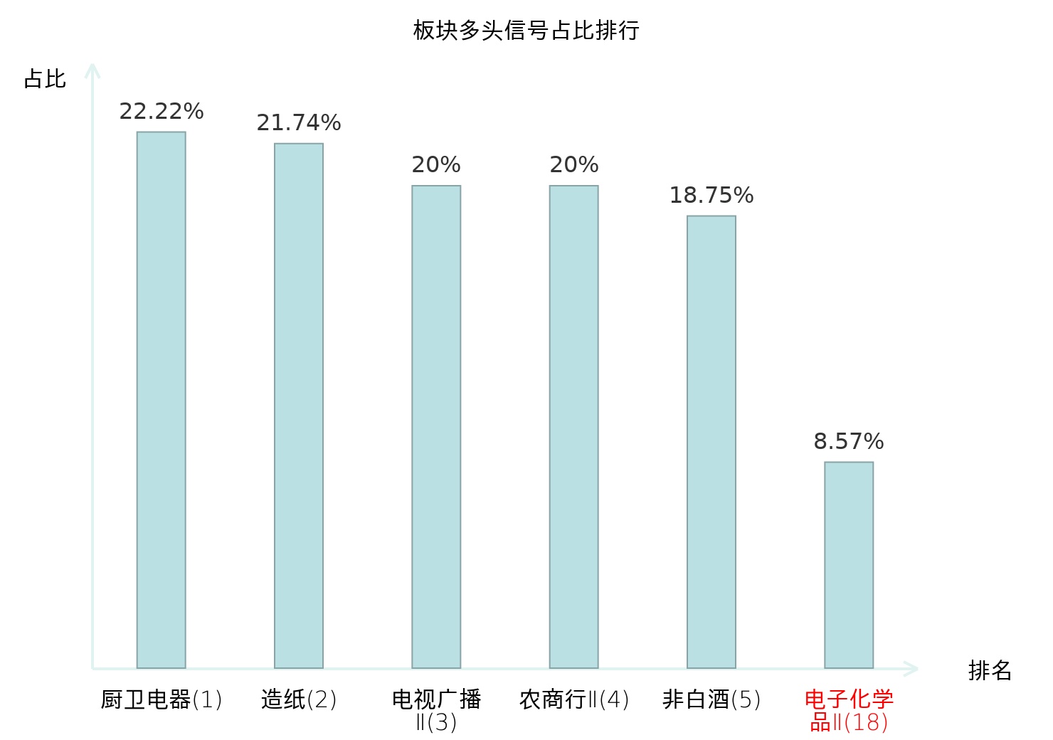 从主力宝信号数据分析,中石科技所属的电子化学品Ⅱ板块中共有3只股票发出主力多头信号,主力多头信号占比在全行业中排名第18位,较昨日上升55位。排名上升表明主力对于该板块的买入意愿有所增强,为主力态度的变化提供了重要参考。全市场所有行业板块中,厨卫电器板块的主力多头信号占比最高,位居第一;厨卫电器板块名次提升最快,较昨日上升115位。这些变动揭示了不同行业间主力资金动向的趋势,为投资者提供了市场情绪和潜在投资机会的重要线索。