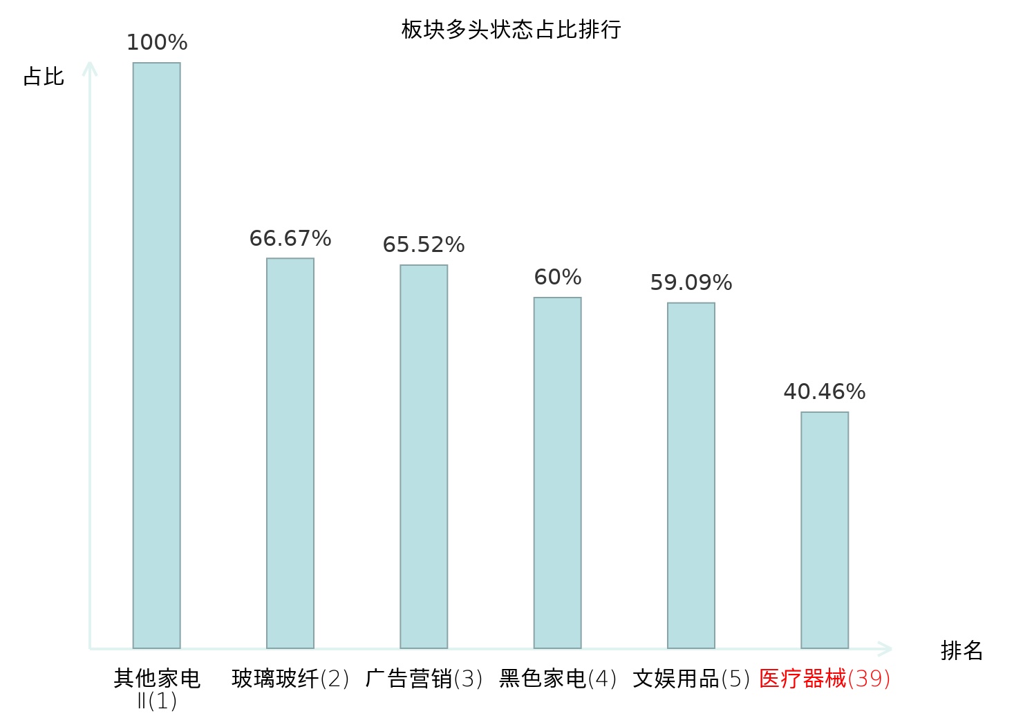全市场所有行业板块中主力多头状态占比排名中,其他家电Ⅱ板块位居第一。体育Ⅱ板块名次提升最快,较昨日上升57位。