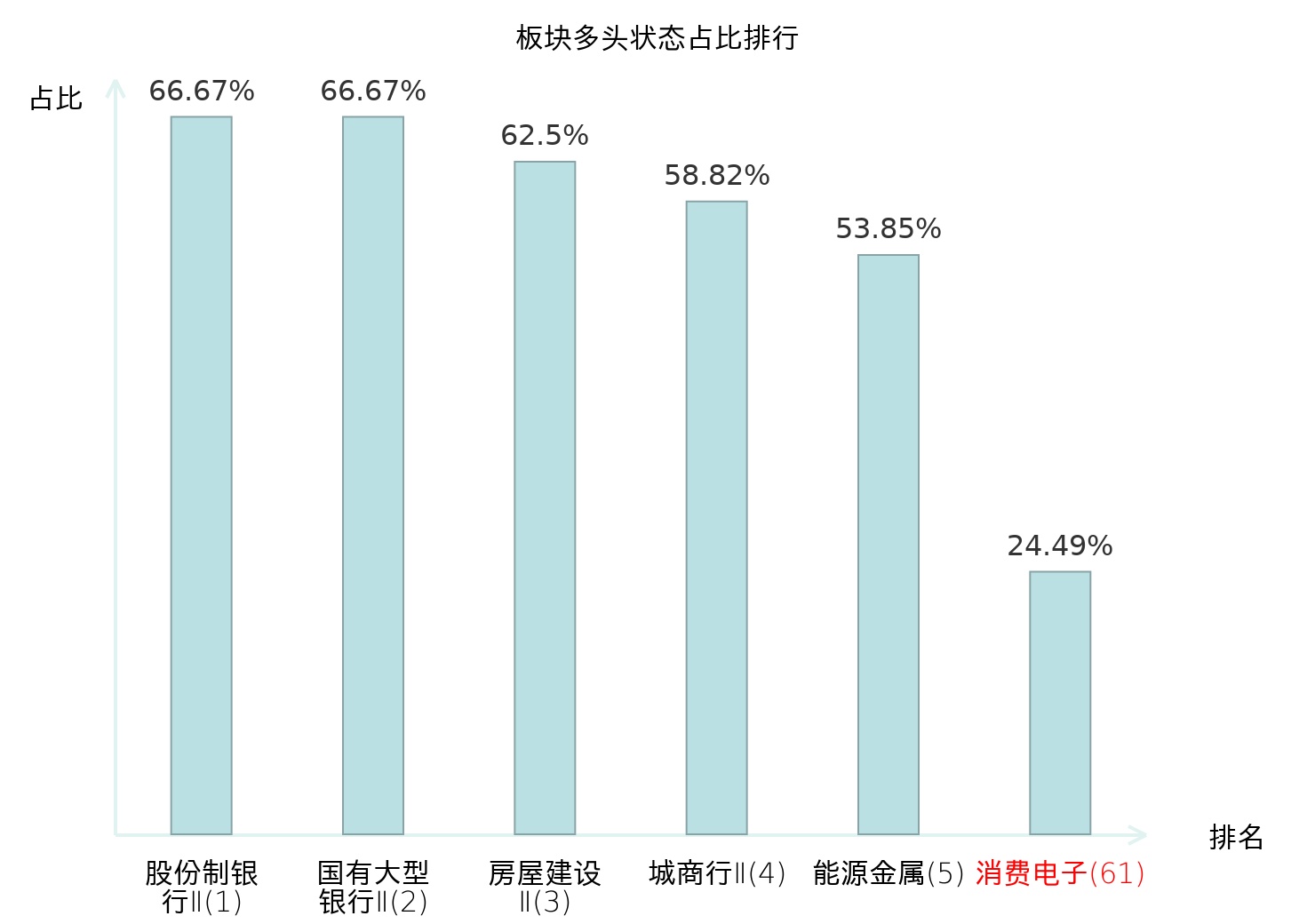 全市场所有行业板块中主力多头状态占比排名中,股份制银行Ⅱ板块位居第一。航空机场板块名次提升最快,较昨日上升68位。