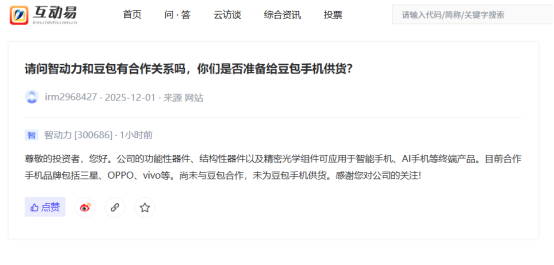 上证报中国证券网讯 智动力12月3日在互动平台回答投资者提问时表示,公司的功能性器件、结构性器件以及精密光学组件可应用于智能手机、AI手机等终端产品。目前合作手机品牌包括三星、OPPO、vivo等。尚未与豆包合作,未为豆包手机供货。
