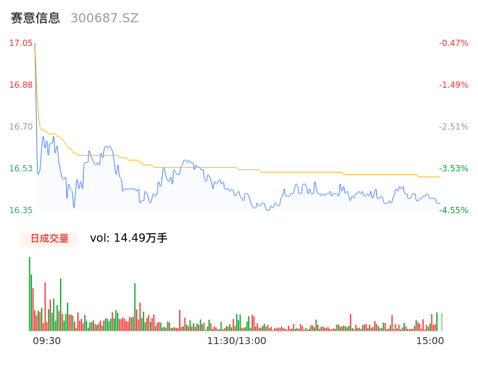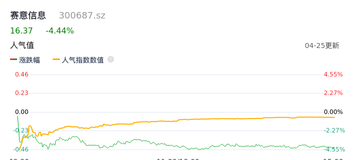 04月25日,赛意信息收报16.37,股价涨幅-4.44%,成交金额2.39亿元,换手率4.49%。