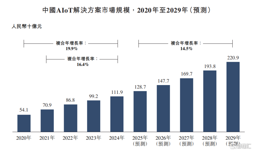 因此,中国AIoT解决方案市场呈现强劲增长态势,从2020年的约541亿元增长至2024年的约1119亿元,复合年增长率约为19.9%,预计2029年将增至2209亿元。