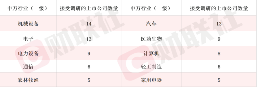 据Choice数据统计,截至周日,沪深两市一共124家上市公司接受机构调研。按照行业划分,机械设备、汽车和电子行业接受机构调研度最高。此外,通信、轻工制造等行业关注度有所提升,电力设备、计算机行业关注度有所下降。