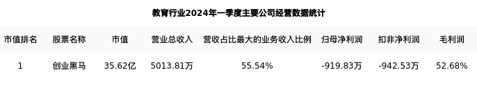 创业黑马最新报告期数据为一季度,下表汇总了教育行业内市值靠前的公司一季度主要经营数据