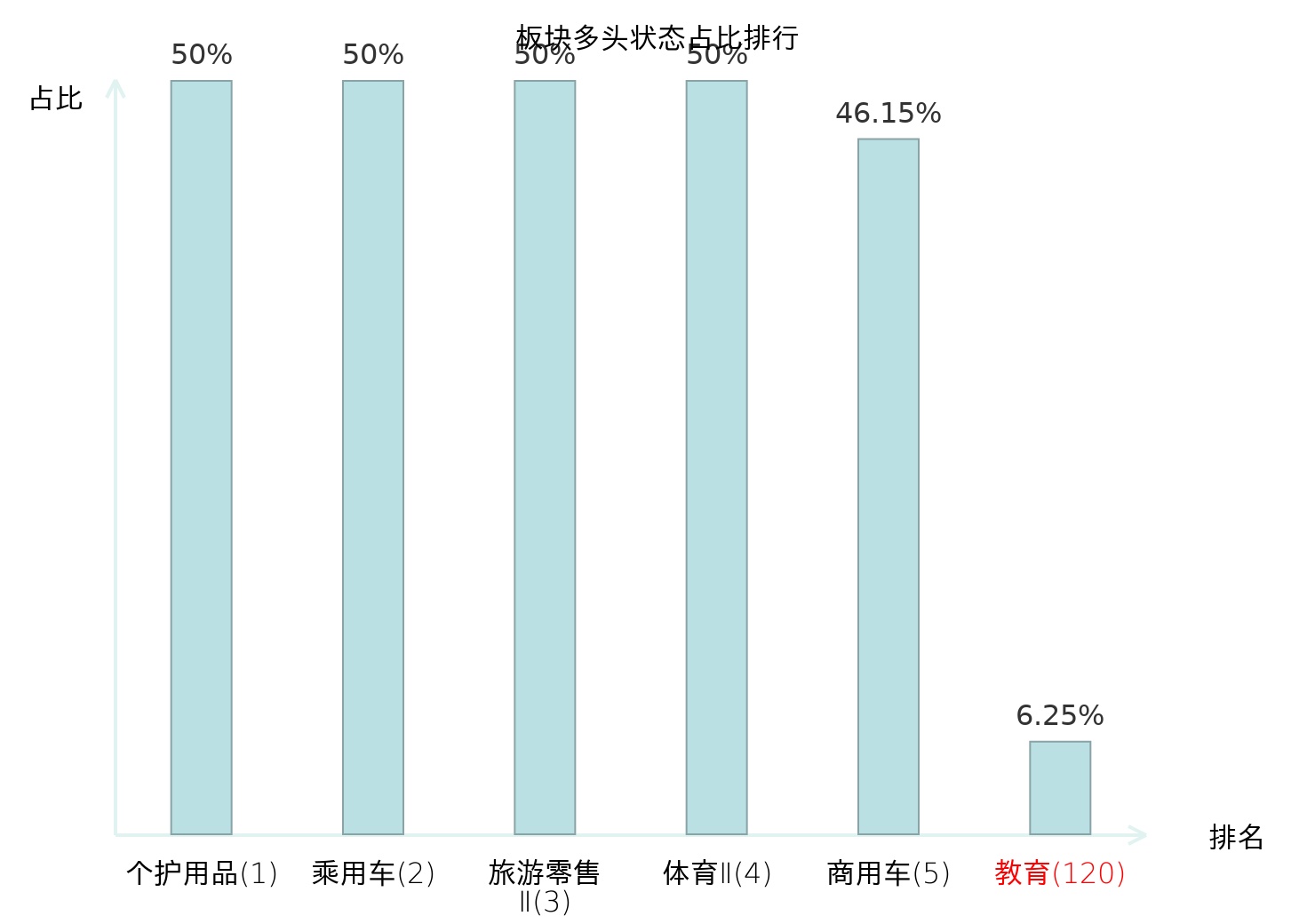 全市场所有行业板块中主力多头状态占比排名中,个护用品板块位居第一。林业Ⅱ板块名次提升最快,较昨日上升94位。