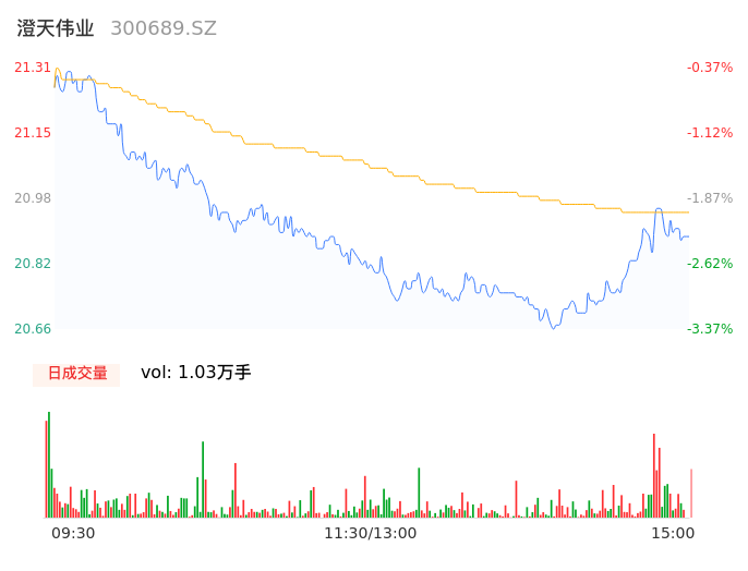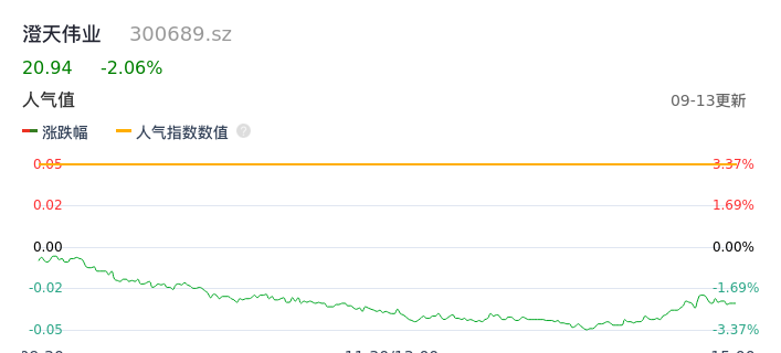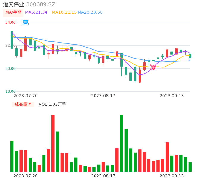09月13日,澄天伟业收报20.94,股价涨幅-2.06%,成交金额2151.58万元,换手率1.03%。
