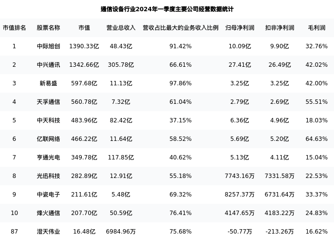 澄天伟业最新报告期数据为一季度,下表汇总了通信设备行业内市值靠前的公司一季度主要经营数据