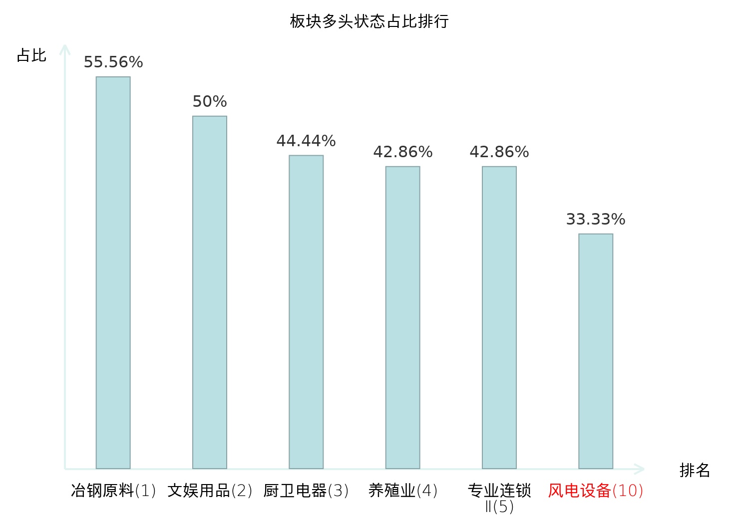 全市场所有行业板块中主力多头状态占比排名中,冶钢原料板块位居第一。能源金属板块名次提升最快,较昨日上升48位。