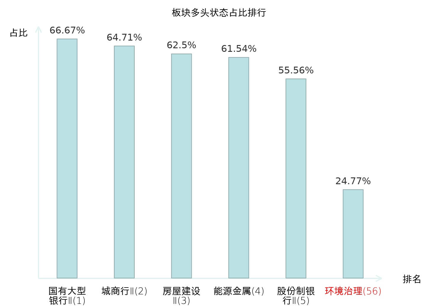 全市场所有行业板块中主力多头状态占比排名中,国有大型银行Ⅱ板块位居第一。普钢板块名次提升最快,较昨日上升65位。