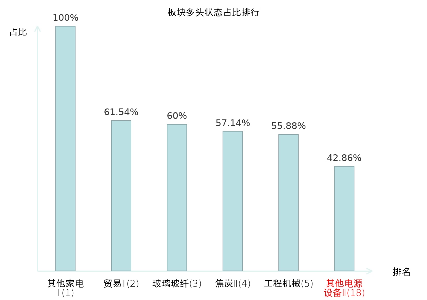 全市场所有行业板块中主力多头状态占比排名中,其他家电Ⅱ板块位居第一。航海装备Ⅱ板块名次提升最快,较昨日上升98位。