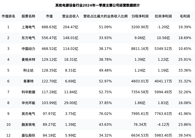 盛弘股份最新报告期数据为一季度,下表汇总了其他电源设备行业内市值靠前的公司一季度主要经营数据