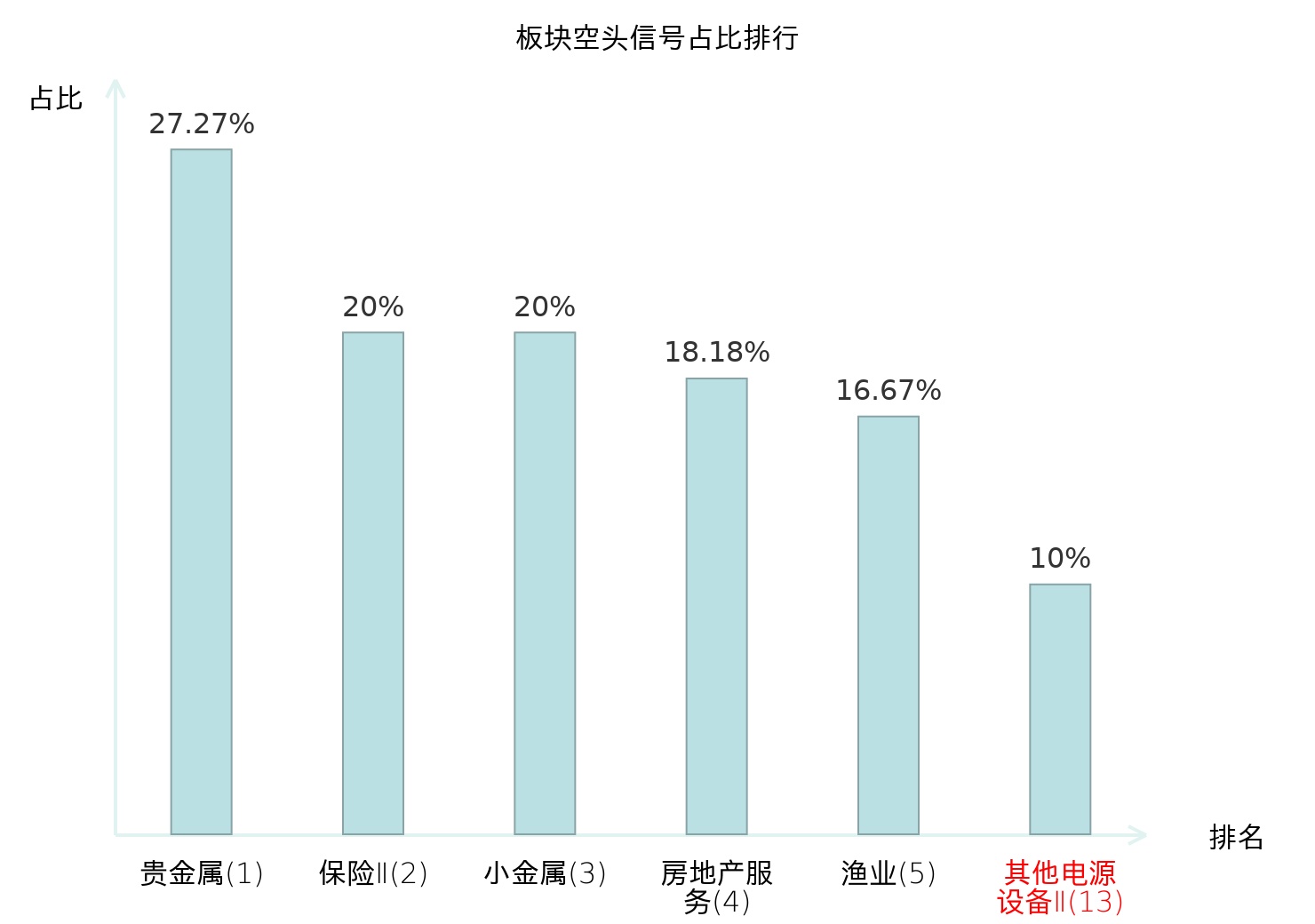 全市场所有行业板块中主力空头信号占比排名中,贵金属板块位居第一。小金属板块名次提升最快,较昨日上升117位。