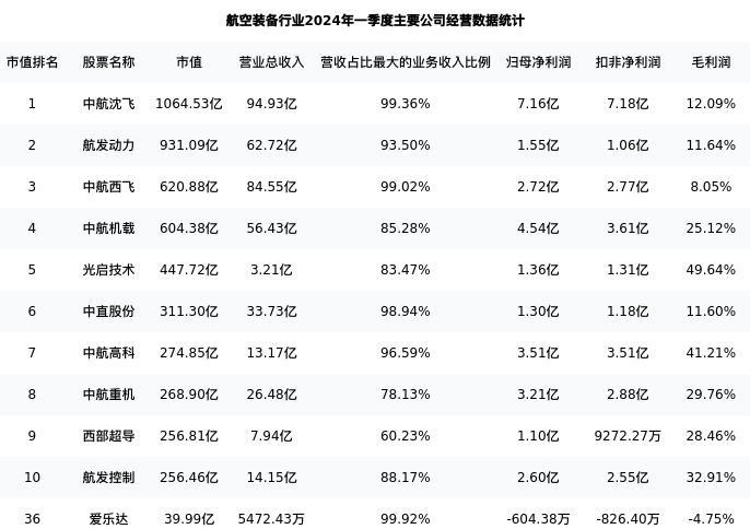 爱乐达最新报告期数据为一季度,下表汇总了航空装备行业内市值靠前的公司一季度主要经营数据
