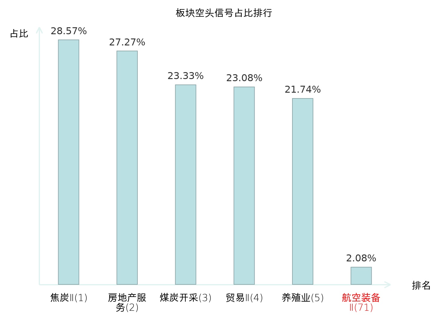 全市场所有行业板块中主力空头信号占比排名中,焦炭Ⅱ板块位居第一。养殖业板块名次提升最快,较昨日上升107位。