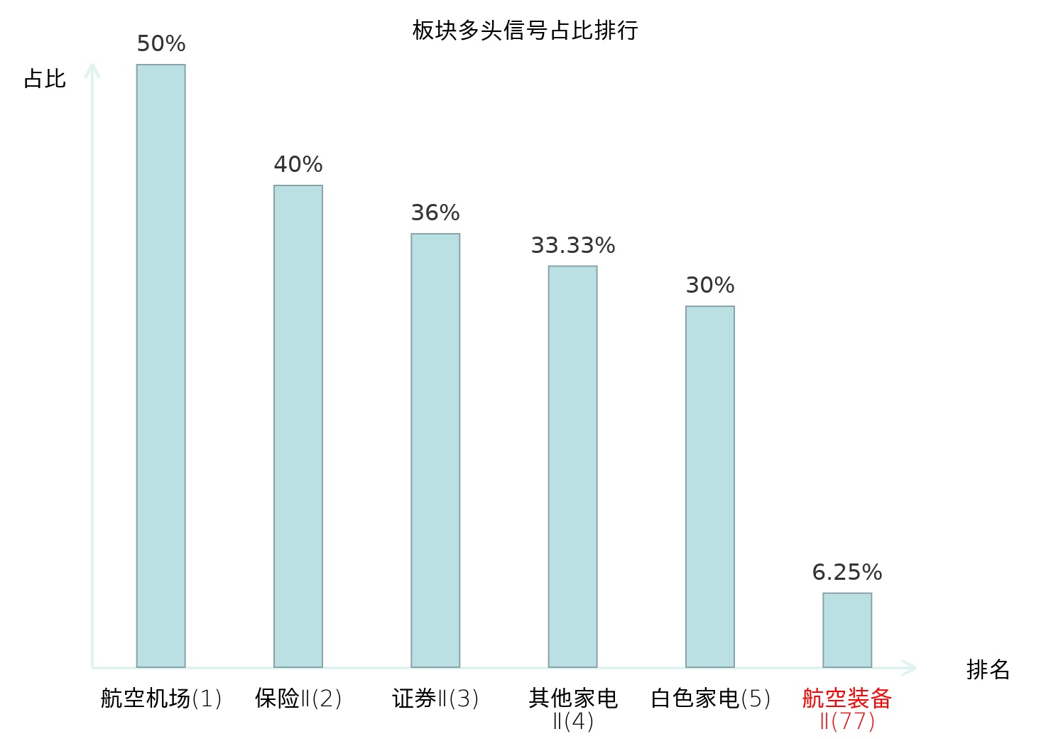 全市场所有行业板块中主力多头信号占比排名中,航空机场板块位居第一。其他家电Ⅱ板块名次提升最快,较昨日上升126位。