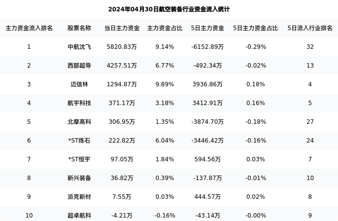 从主力资金流向来看,航空装备行业今日主力资金流入39.64亿元,在所有申万二级行业中排名:75/131。