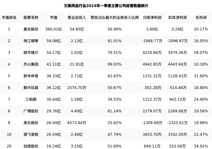 创源股份最新报告期数据为一季度,下表汇总了文娱用品行业内市值靠前的公司一季度主要经营数据