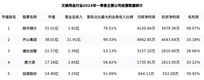 创源股份最新报告期数据为一季度,下表汇总了文娱用品行业内市值靠前的公司一季度主要经营数据