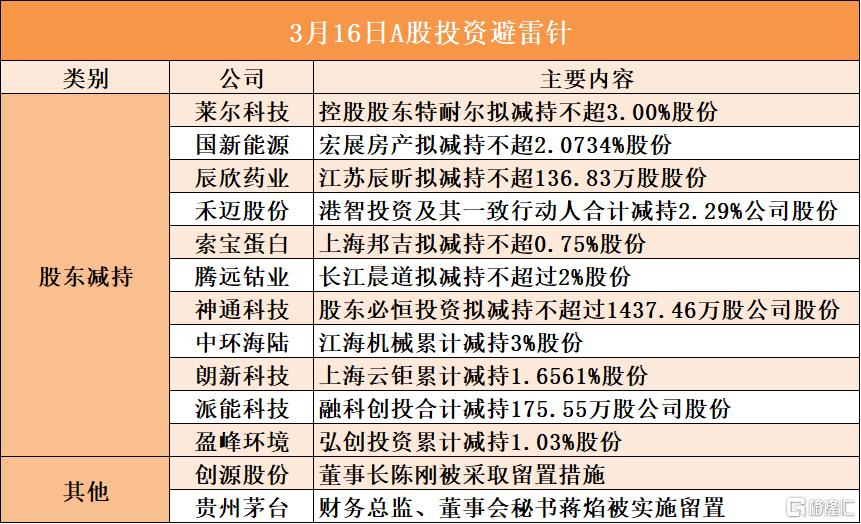 3月16日A股投资避雷针︱创源股份:董事长陈刚被采取留置措施;贵州茅台:财务总监、董事会秘书蒋焰被实施留置