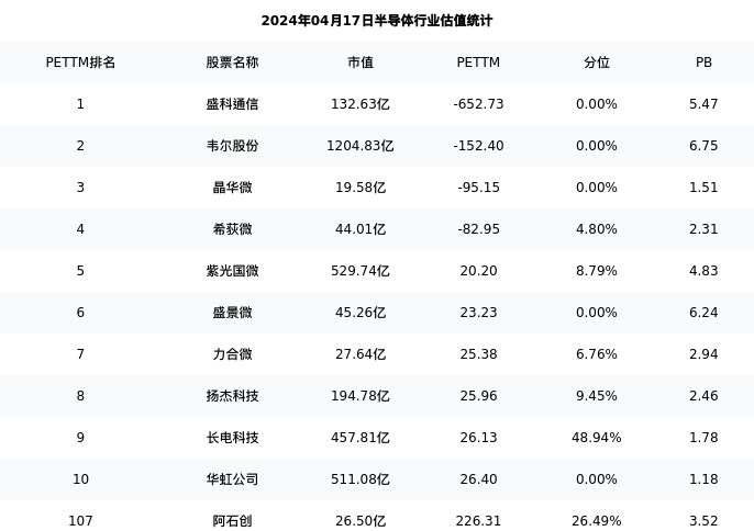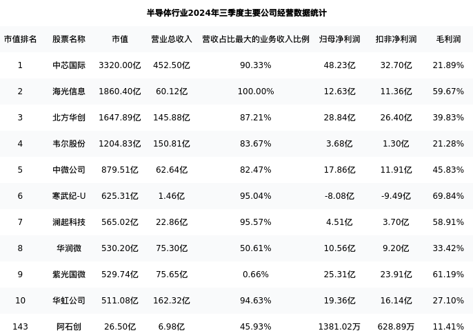 阿石创最新报告期数据为三季度,下表汇总了半导体行业内市值靠前的公司三季度主要经营数据