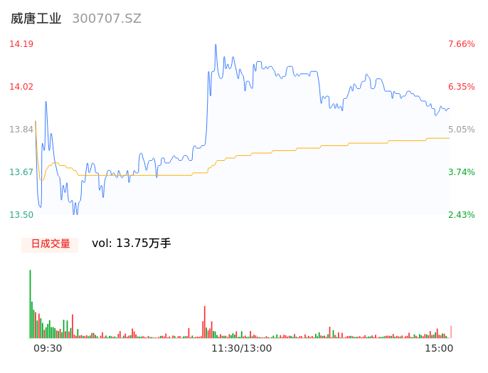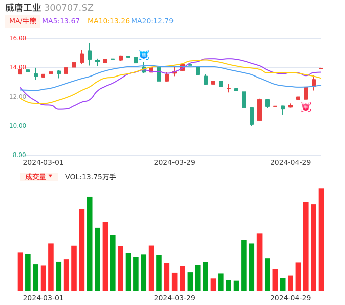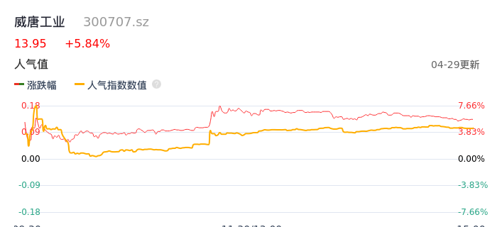 04月29日,威唐工业收报13.95,股价涨幅5.84%,成交金额1.90亿元,换手率11.04%。