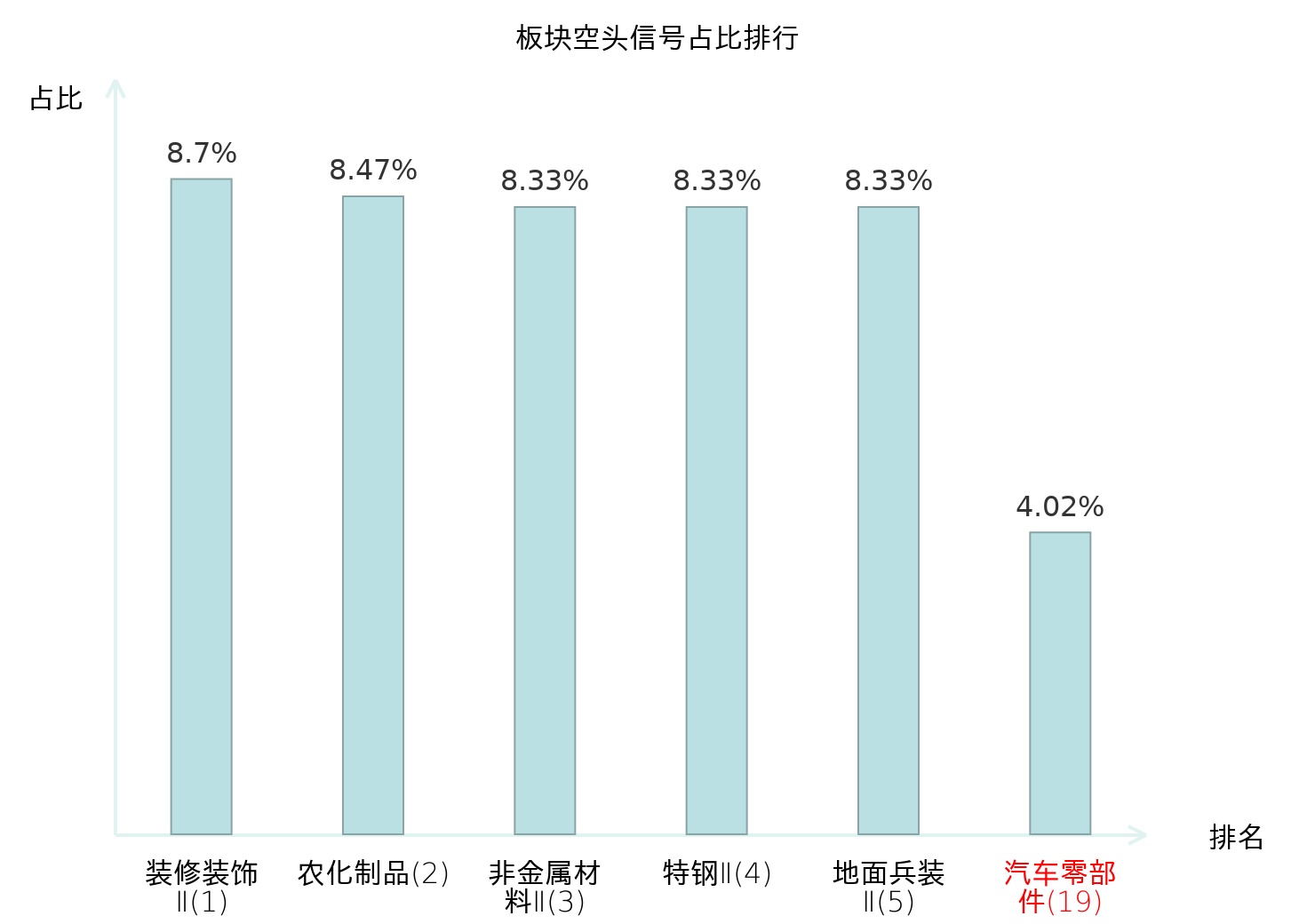 全市场所有行业板块中主力空头信号占比排名中,装修装饰Ⅱ板块位居第一。装修装饰Ⅱ板块名次提升最快,较昨日上升120位。