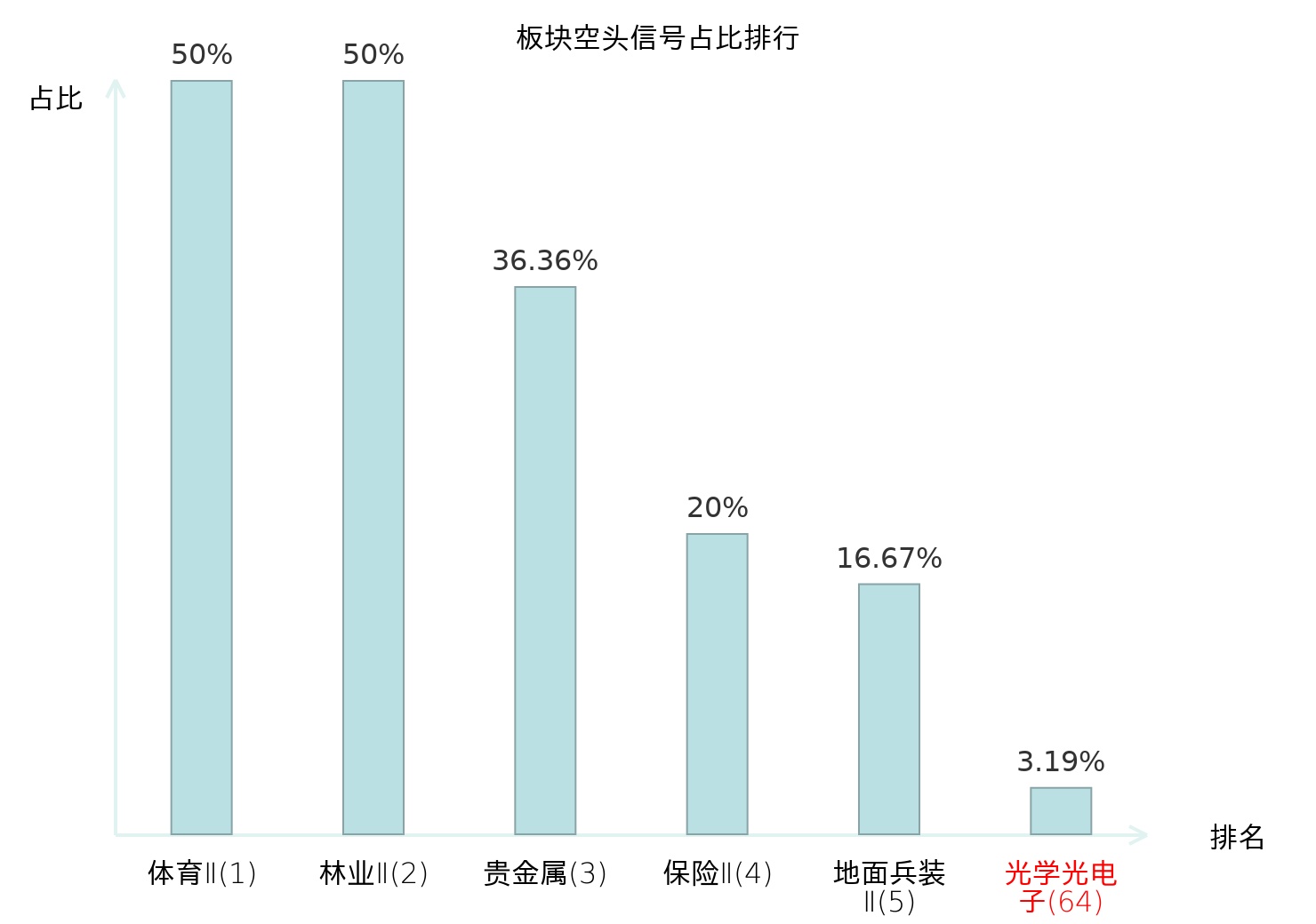 全市场所有行业板块中主力空头信号占比排名中,体育Ⅱ板块位居第一。电子化学品Ⅱ板块名次提升最快,较昨日上升110位。