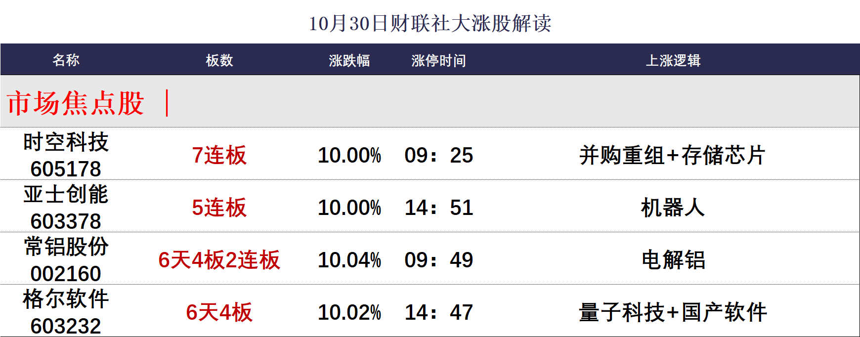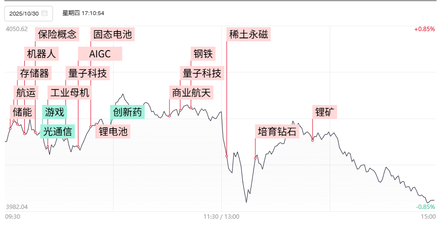 财联社10月30日讯,今日46股涨停,23股炸板,封板率为67%,时空科技7连板,亚士创能5连板,瑞尔特、合富中国、德龙汇能3连板,常铝股份、格尔软件6天4板。市场震荡调整,三大指数盘中均出现跳水,创业板指跌近2%,沪指失守4000点。沪深两市成交额2.42万亿,较上一个交易日放量1656亿。盘面上,市场热点较为杂乱,全市场4100只个股下跌。板块方面,能源金属、钢铁、量子科技、电池等板块涨幅居前,CPO、游戏、煤炭等板块跌幅居前。截至收盘,沪指跌0.73%,深成指跌1.16%,创业板指跌1.84%。