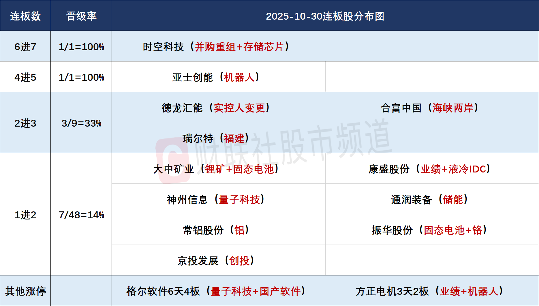 连板晋级率降至41.66%,3板以上高标股中时空科技继续一字涨停晋级7连板,亚士创能巨量换手晋级5连板,此前连续3日以一字涨停晋级的福建自贸区概念人气股平潭发展巨量分歧未能实现5进6,但前期人气股世龙实业遭遇二连跌停。随着上市公司三季报业绩披露临近尾声,相关个股对三季报业绩反映剧烈,2连板的海兴电力在内的多股涨停,国电南自、荣泰健康等多只三季报业绩暴雷股遭遇跌停。昨日活跃的近端次新股也表现出不俗溢价,C奕材、C必贝特、C禾元盘中均一度涨超9%。与此同时,部分红利股仍表现抗跌,新华保险盘中一度创出历史新高,宝钢股份、中国神华逆势涨超2%。在科技主线降温之际,高股息+小微盘股的哑铃风格重新获得资金青睐。