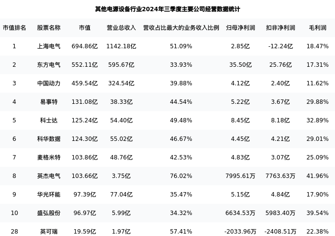 英可瑞最新报告期数据为三季度,下表汇总了其他电源设备行业内市值靠前的公司三季度主要经营数据