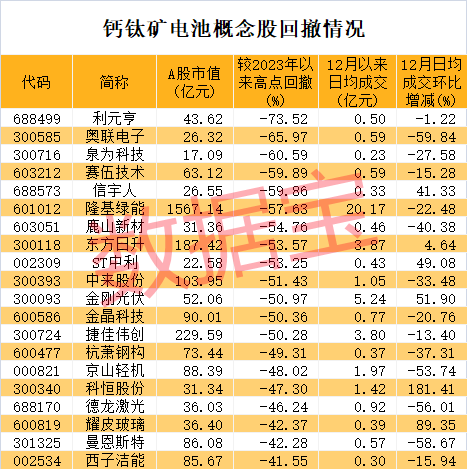 2023年新能源赛道大幅降温,钙钛矿电池概念股也不例外。证券时报·数据宝统计,截至12月27日收盘,概念股收盘价较年内高点平均回撤40.27%。13股回撤幅度超50%,其中利元亨、奥联电子、泉为科技、赛伍技术、信宇人回撤幅度排在前五位。